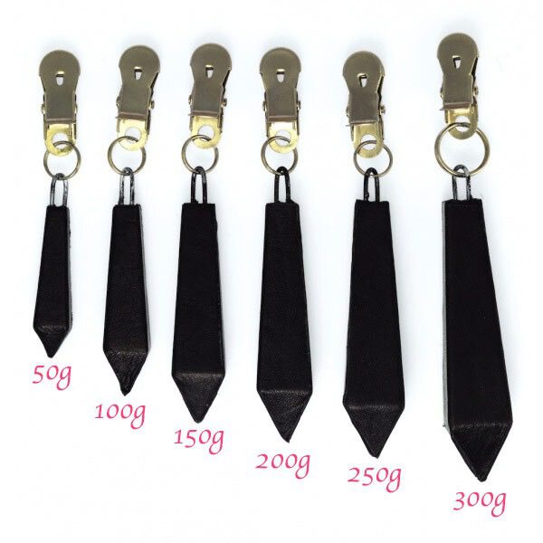 The fabulous Long Nipple Clamps with Weight features a silver nipple clamp with a small ‘O’ ring to which a long black leather covered weights with a soft feel and clamp to each nipple to inflict a tugging sensation.