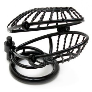 A cock ring that fits behind the balls and a wire cage that encloses and contain the cock.